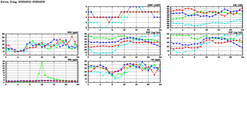| Air Quality Data Time Series in Kwun Tong (2025/12/06) | ( Line colors: Day -3 Day -2 Day -1 Current day ) | 2D Map Current AQHI |