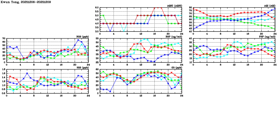 | Air Quality Data Time Series in Kwun Tong (2025/12/09) | ( Line colors: Day -3 Day -2 Day -1 Current day ) | 2D Map Current AQHI |