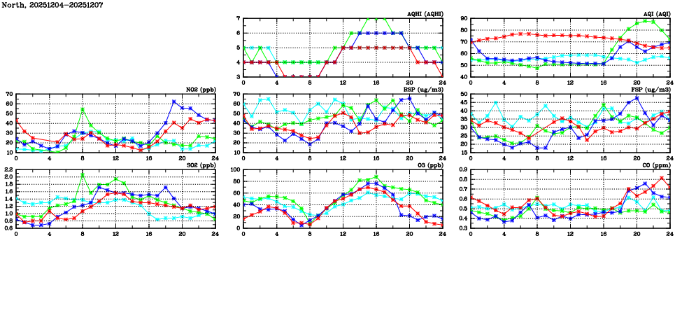 | Air Quality Data Time Series in North (2025/12/07) | ( Line colors: Day -3 Day -2 Day -1 Current day ) | 2D Map Current AQHI |