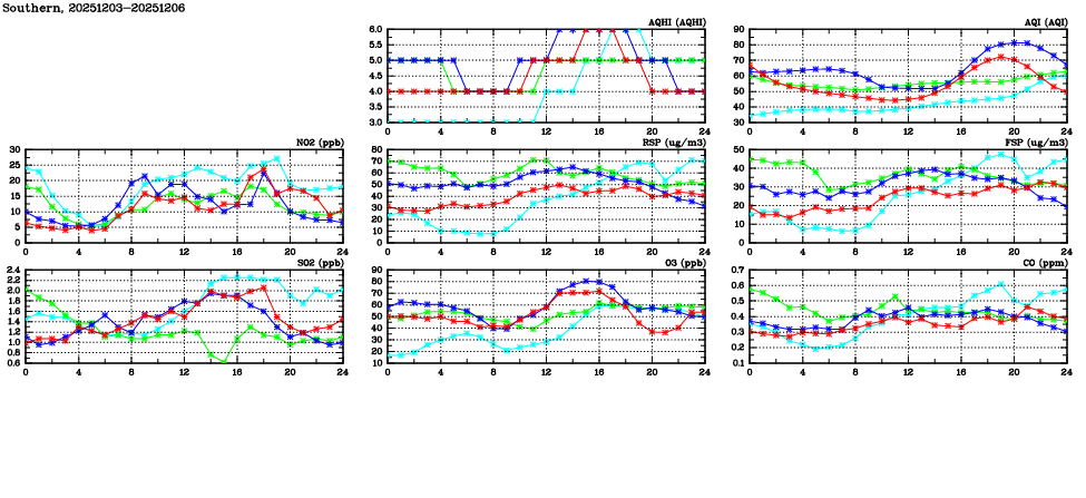 | Air Quality Data Time Series in Southern (2025/12/06) | ( Line colors: Day -3 Day -2 Day -1 Current day ) | 2D Map Current AQHI |