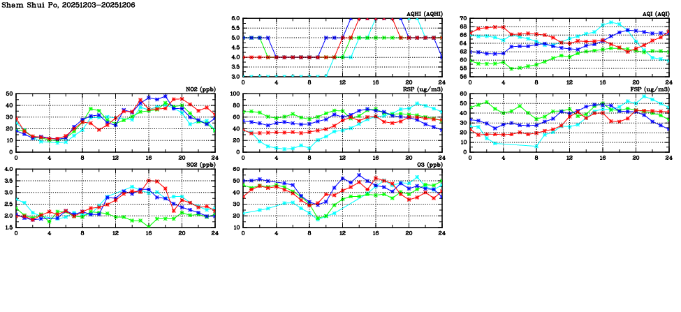 | Air Quality Data Time Series in Sham Shui Po (2025/12/06) | ( Line colors: Day -3 Day -2 Day -1 Current day ) | 2D Map Current AQHI |