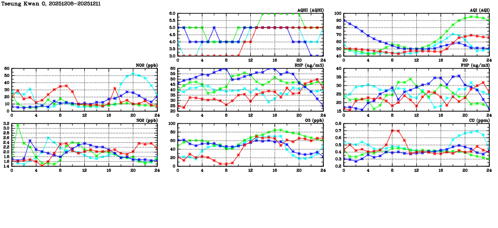 | Air Quality Data Time Series in Tseung Kwan O (2025/12/11) | ( Line colors: Day -3 Day -2 Day -1 Current day ) | 2D Map Current AQHI |