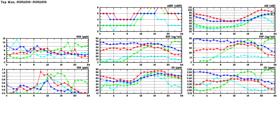 | Air Quality Data Time Series in Tap Mun (2025/12/05) | ( Line colors: Day -3 Day -2 Day -1 Current day ) | 2D Map Current AQHI |