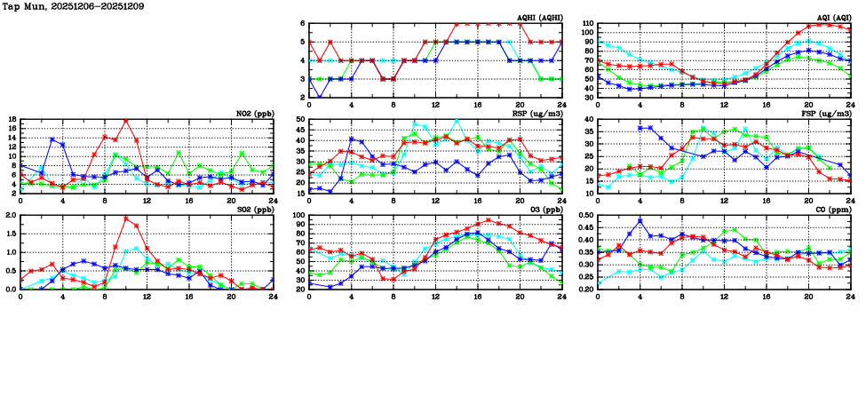 | Air Quality Data Time Series in Tap Mun (2025/12/09) | ( Line colors: Day -3 Day -2 Day -1 Current day ) | 2D Map Current AQHI |