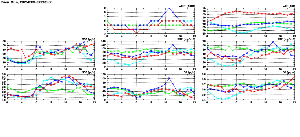 | Air Quality Data Time Series in Tuen Mun (2025/12/06) | ( Line colors: Day -3 Day -2 Day -1 Current day ) | 2D Map Current AQHI |