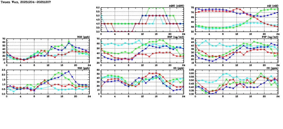 | Air Quality Data Time Series in Tsuen Wan (2025/12/07) | ( Line colors: Day -3 Day -2 Day -1 Current day ) | 2D Map Current AQHI |