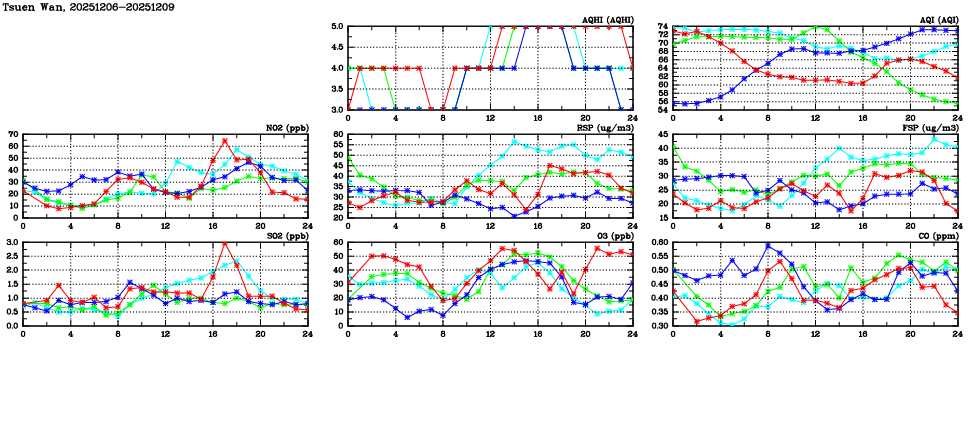 | Air Quality Data Time Series in Tsuen Wan (2025/12/09) | ( Line colors: Day -3 Day -2 Day -1 Current day ) | 2D Map Current AQHI |
