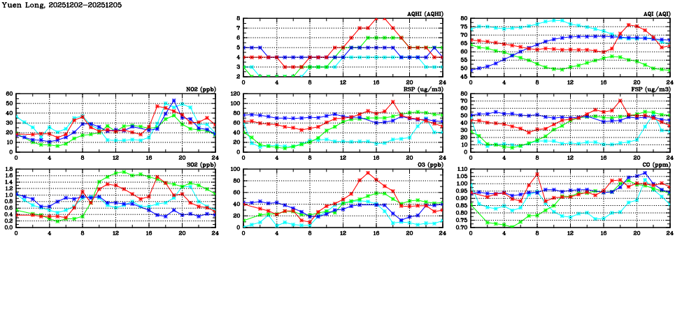 | Air Quality Data Time Series in Yuen Long (2025/12/05) | ( Line colors: Day -3 Day -2 Day -1 Current day ) | 2D Map Current AQHI |