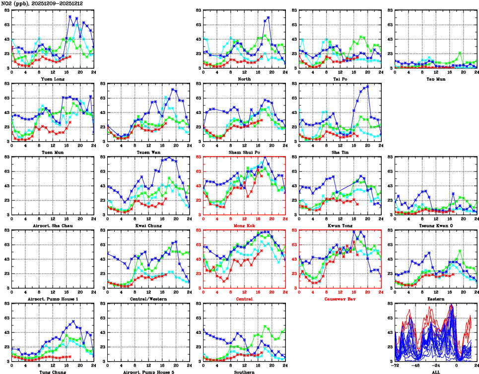 | Air Quality Data Time Series for NO2 (2025/12/12) | ( Line colors: Day -3 Day -2 Day -1 Current day ) | 2D Map Current AQHI |