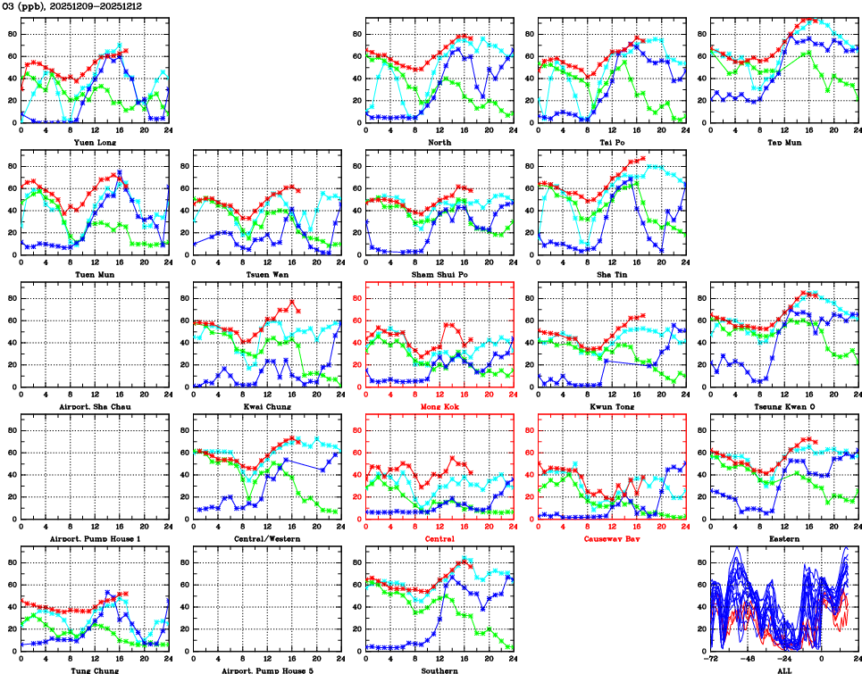 | Air Quality Data Time Series for O3 (2025/12/12) | ( Line colors: Day -3 Day -2 Day -1 Current day ) | 2D Map Current AQHI |