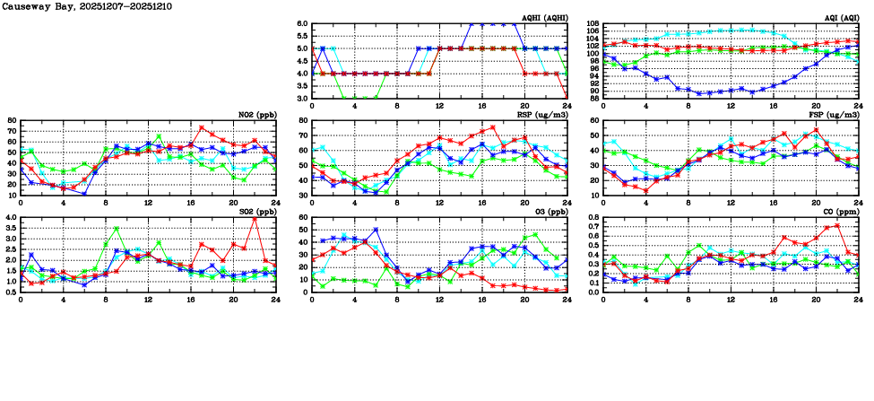 | Air Quality Data Time Series in Causeway Bay (2025/12/10) | ( Line colors: Day -3 Day -2 Day -1 Current day ) | 2D Map Current AQHI |