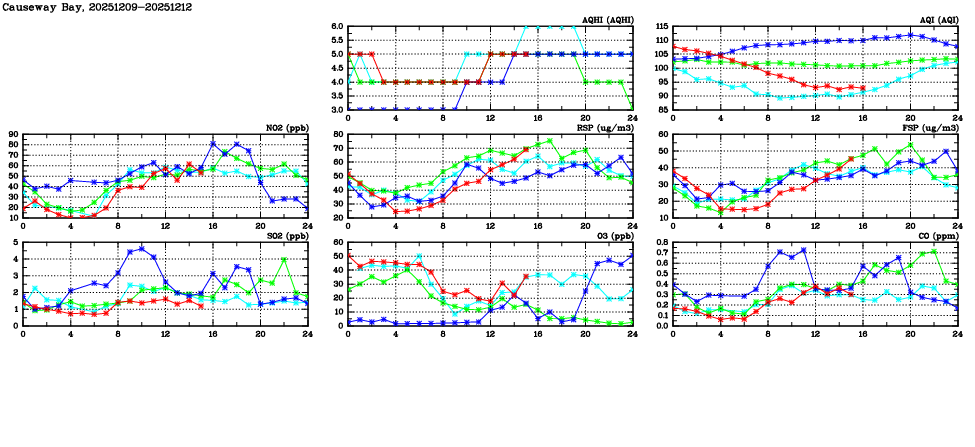 | Air Quality Data Time Series in Causeway Bay (2025/12/12) | ( Line colors: Day -3 Day -2 Day -1 Current day ) | 2D Map Current AQHI |