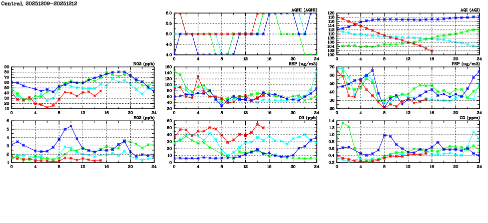| Air Quality Data Time Series in Central (2025/12/12) | ( Line colors: Day -3 Day -2 Day -1 Current day ) | 2D Map Current AQHI |