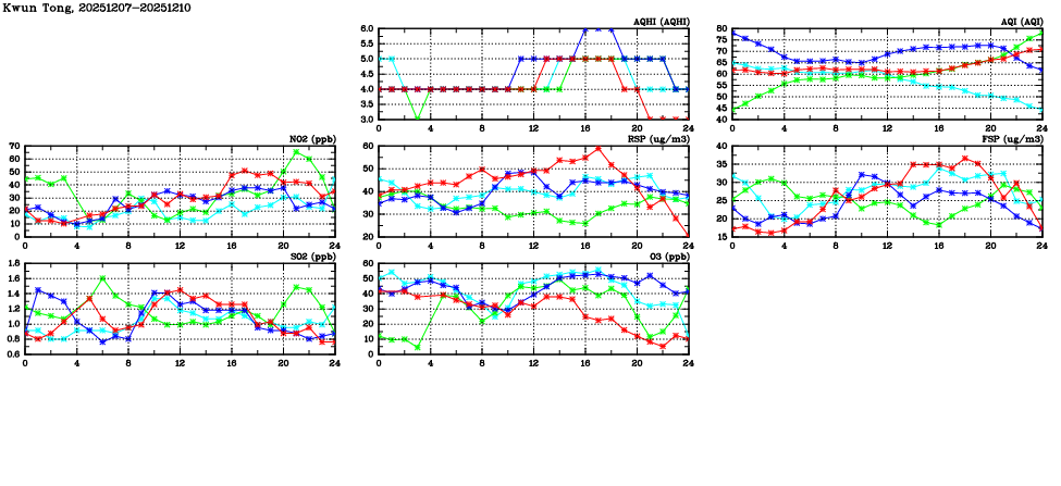 | Air Quality Data Time Series in Kwun Tong (2025/12/10) | ( Line colors: Day -3 Day -2 Day -1 Current day ) | 2D Map Current AQHI |