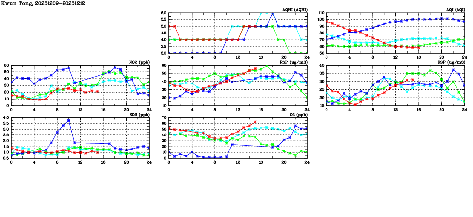 | Air Quality Data Time Series in Kwun Tong (2025/12/12) | ( Line colors: Day -3 Day -2 Day -1 Current day ) | 2D Map Current AQHI |
