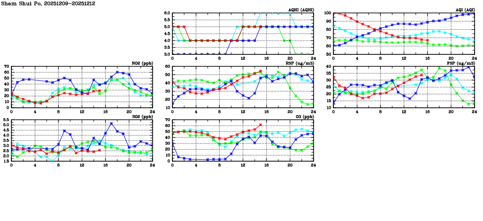 | Air Quality Data Time Series in Sham Shui Po (2025/12/12) | ( Line colors: Day -3 Day -2 Day -1 Current day ) | 2D Map Current AQHI |