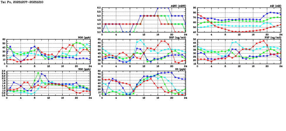 | Air Quality Data Time Series in Tai Po (2025/12/10) | ( Line colors: Day -3 Day -2 Day -1 Current day ) | 2D Map Current AQHI |