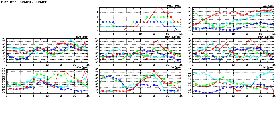| Parameters: | AQHI | AQI | RSP | FSP | NO2 | SO2 | O3 | CO | Temp | WS | WD |
