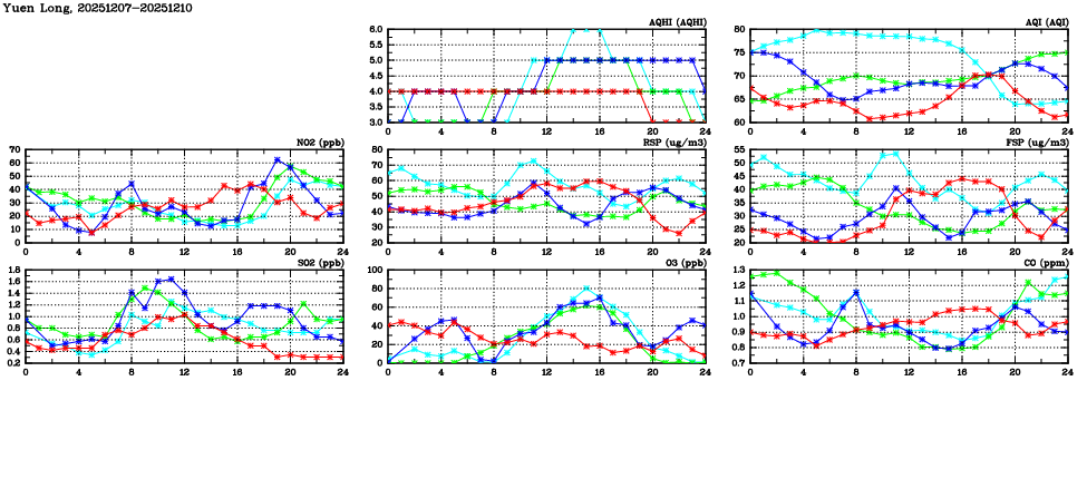 | Air Quality Data Time Series in Yuen Long (2025/12/10) | ( Line colors: Day -3 Day -2 Day -1 Current day ) | 2D Map Current AQHI |