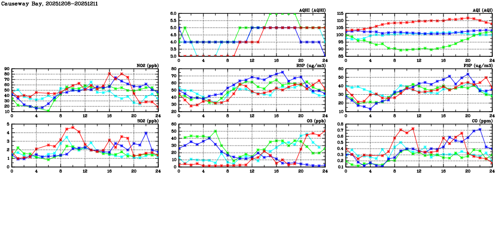 | Air Quality Data Time Series in Causeway Bay (2025/12/11) | ( Line colors: Day -3 Day -2 Day -1 Current day ) | 2D Map Current AQHI |