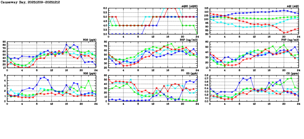 | Air Quality Data Time Series in Causeway Bay (2025/12/12) | ( Line colors: Day -3 Day -2 Day -1 Current day ) | 2D Map Current AQHI |