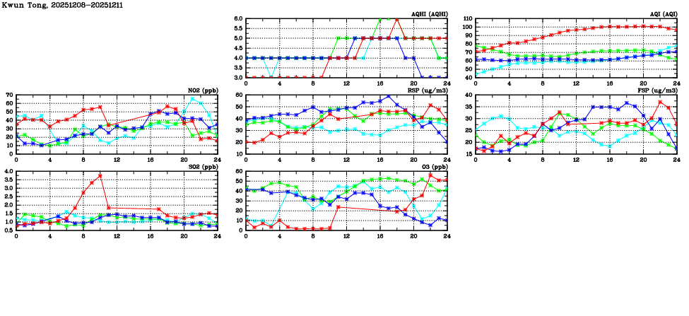 | Air Quality Data Time Series in Kwun Tong (2025/12/11) | ( Line colors: Day -3 Day -2 Day -1 Current day ) | 2D Map Current AQHI |