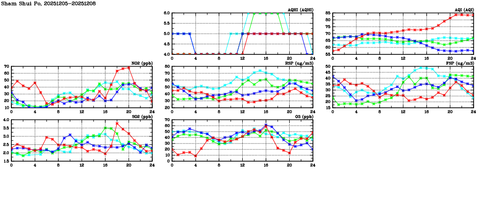 | Air Quality Data Time Series in Sham Shui Po (2025/12/08) | ( Line colors: Day -3 Day -2 Day -1 Current day ) | 2D Map Current AQHI |