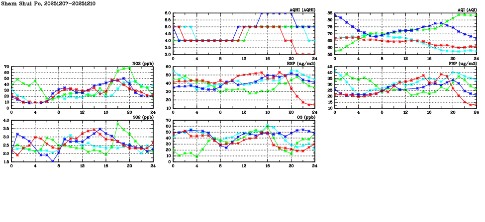 | Air Quality Data Time Series in Sham Shui Po (2025/12/10) | ( Line colors: Day -3 Day -2 Day -1 Current day ) | 2D Map Current AQHI |