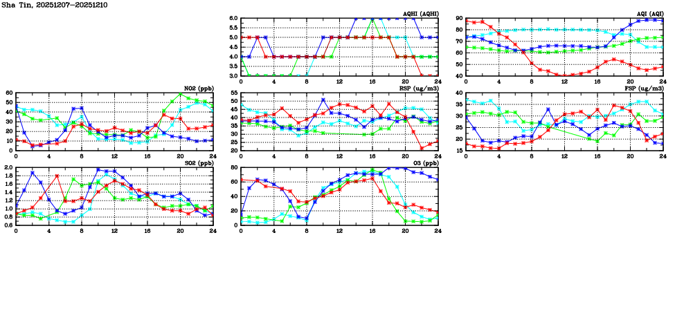 | Air Quality Data Time Series in Sha Tin (2025/12/10) | ( Line colors: Day -3 Day -2 Day -1 Current day ) | 2D Map Current AQHI |
