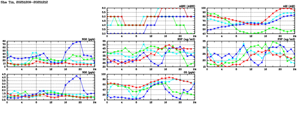 | Air Quality Data Time Series in Sha Tin (2025/12/12) | ( Line colors: Day -3 Day -2 Day -1 Current day ) | 2D Map Current AQHI |