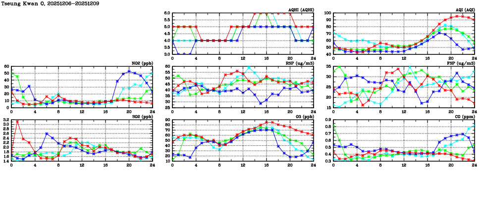 | Air Quality Data Time Series in Tseung Kwan O (2025/12/09) | ( Line colors: Day -3 Day -2 Day -1 Current day ) | 2D Map Current AQHI |