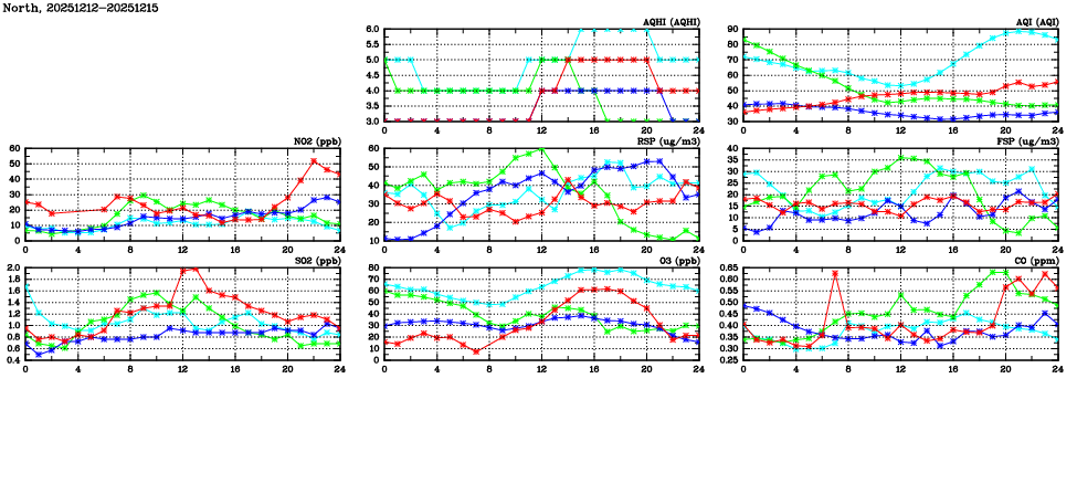 | Air Quality Data Time Series in North (2025/12/15) | ( Line colors: Day -3 Day -2 Day -1 Current day ) | 2D Map Current AQHI |