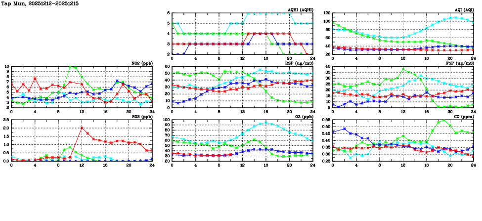 | Air Quality Data Time Series in Tap Mun (2025/12/15) | ( Line colors: Day -3 Day -2 Day -1 Current day ) | 2D Map Current AQHI |