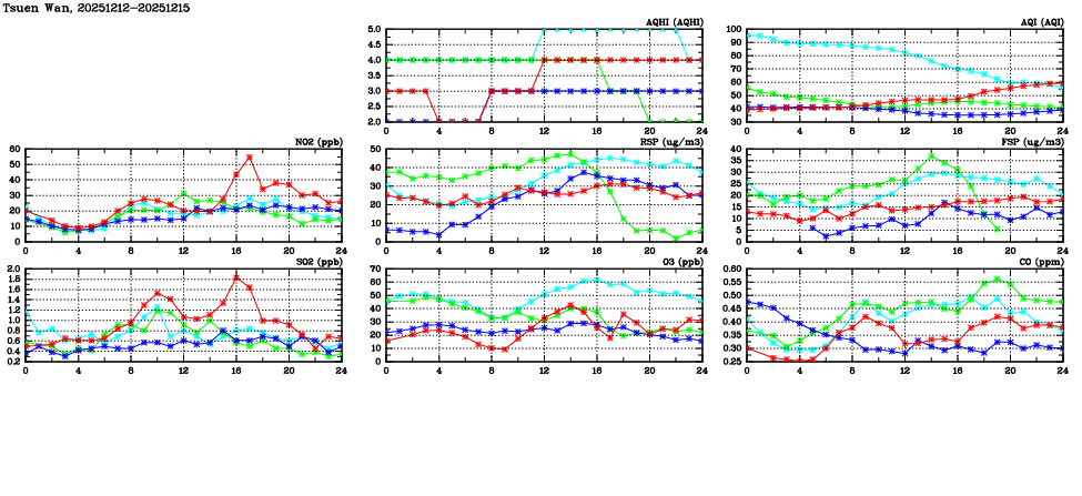 | Air Quality Data Time Series in Tsuen Wan (2025/12/15) | ( Line colors: Day -3 Day -2 Day -1 Current day ) | 2D Map Current AQHI |