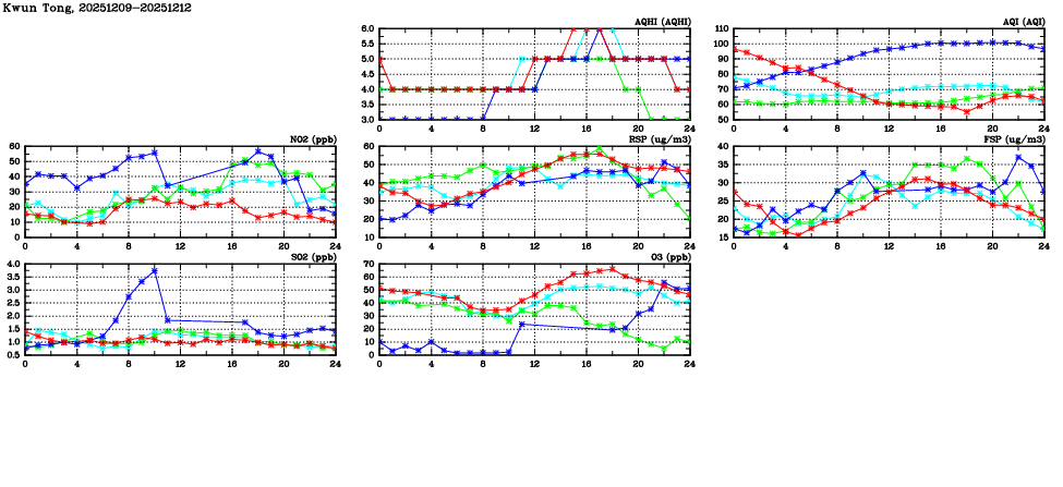| Air Quality Data Time Series in Kwun Tong (2025/12/12) | ( Line colors: Day -3 Day -2 Day -1 Current day ) | 2D Map Current AQHI |