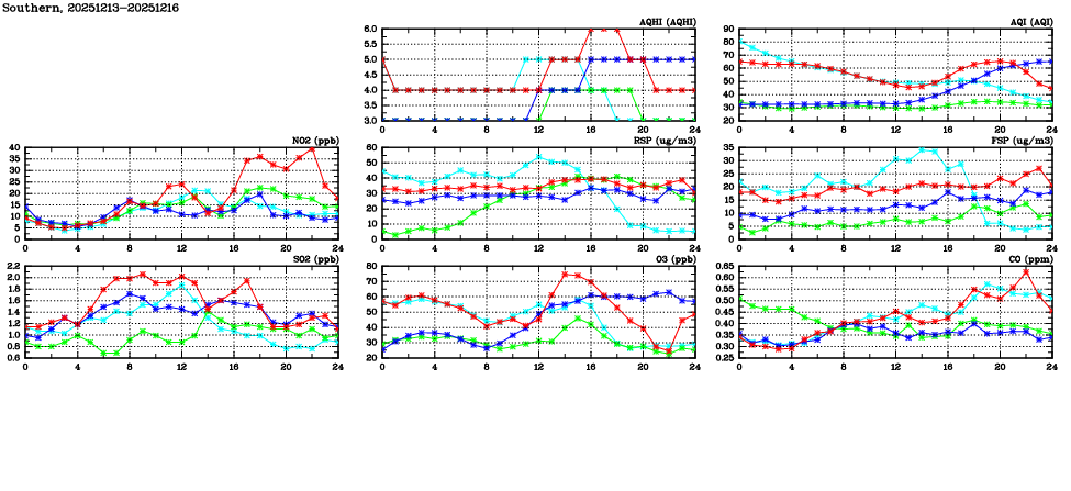 | Air Quality Data Time Series in Southern (2025/12/16) | ( Line colors: Day -3 Day -2 Day -1 Current day ) | 2D Map Current AQHI |