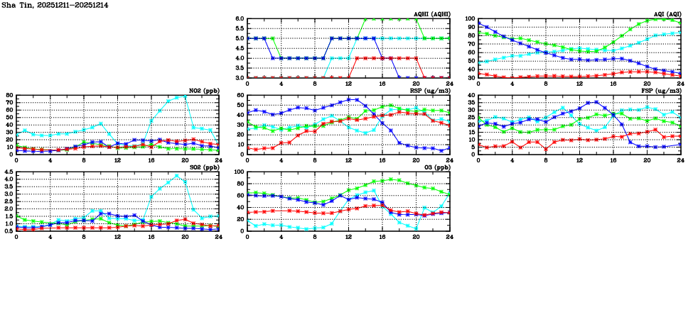 | Air Quality Data Time Series in Sha Tin (2025/12/14) | ( Line colors: Day -3 Day -2 Day -1 Current day ) | 2D Map Current AQHI |