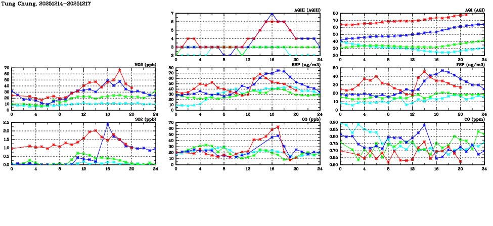 | Air Quality Data Time Series in Tung Chung (2025/12/17) | ( Line colors: Day -3 Day -2 Day -1 Current day ) | 2D Map Current AQHI |