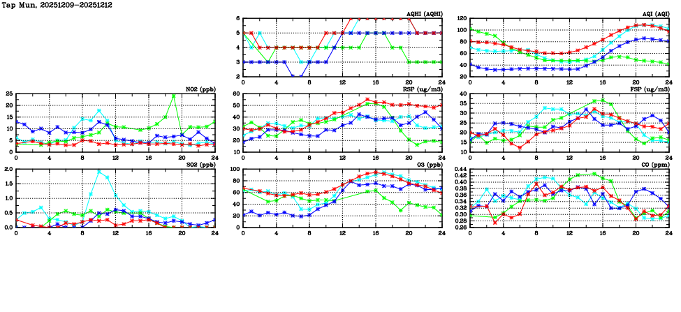 | Air Quality Data Time Series in Tap Mun (2025/12/12) | ( Line colors: Day -3 Day -2 Day -1 Current day ) | 2D Map Current AQHI |