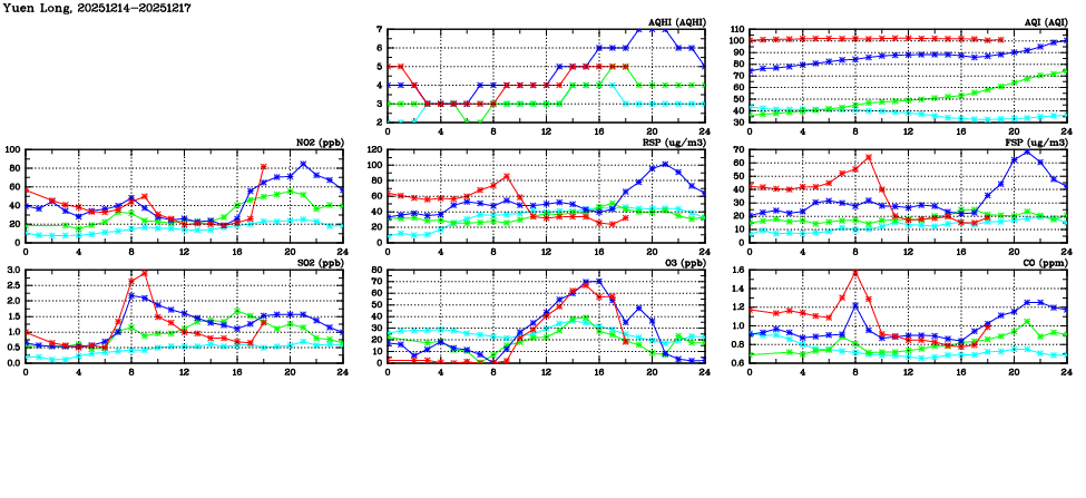 | Air Quality Data Time Series in Yuen Long (2025/12/17) | ( Line colors: Day -3 Day -2 Day -1 Current day ) | 2D Map Current AQHI |