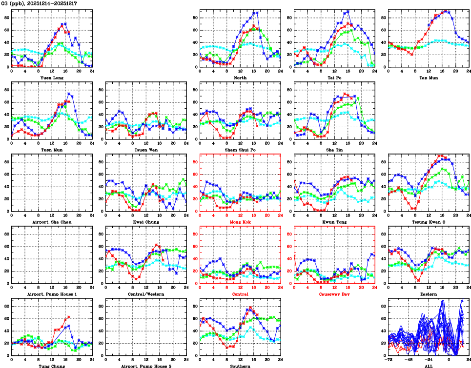 | Air Quality Data Time Series for O3 (2025/12/17) | ( Line colors: Day -3 Day -2 Day -1 Current day ) | 2D Map Current AQHI |