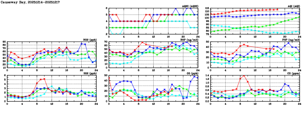 | Air Quality Data Time Series in Causeway Bay (2025/12/17) | ( Line colors: Day -3 Day -2 Day -1 Current day ) | 2D Map Current AQHI |