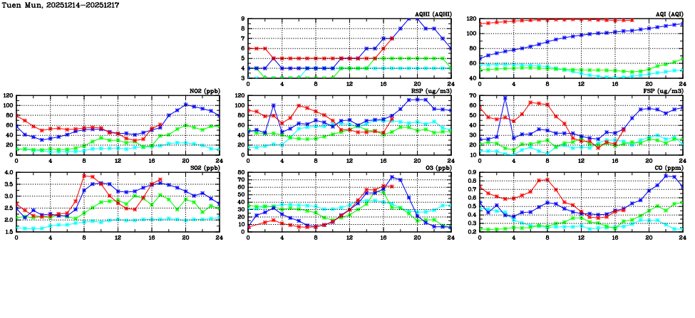 | Air Quality Data Time Series in Tuen Mun (2025/12/17) | ( Line colors: Day -3 Day -2 Day -1 Current day ) | 2D Map Current AQHI |