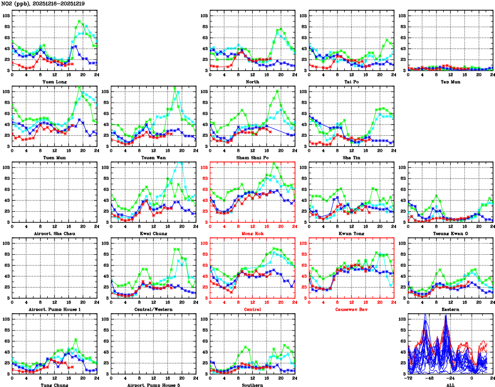 | Air Quality Data Time Series for NO2 (2025/12/19) | ( Line colors: Day -3 Day -2 Day -1 Current day ) | 2D Map Current AQHI |