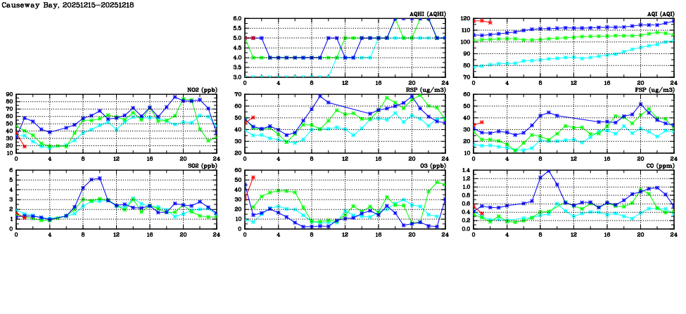 | Air Quality Data Time Series in Causeway Bay (2025/12/18) | ( Line colors: Day -3 Day -2 Day -1 Current day ) | 2D Map Current AQHI |