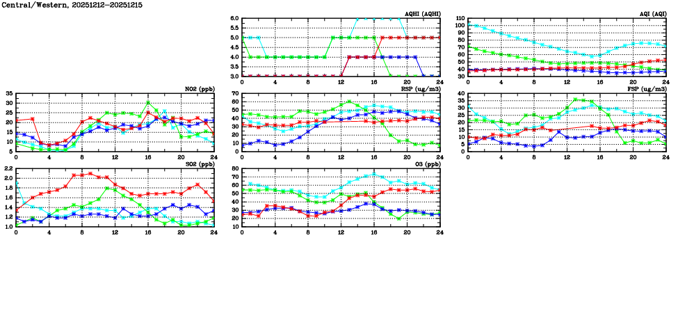 | Air Quality Data Time Series in Central/Western (2025/12/15) | ( Line colors: Day -3 Day -2 Day -1 Current day ) | 2D Map Current AQHI |