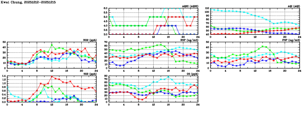 | Air Quality Data Time Series in Kwai Chung (2025/12/15) | ( Line colors: Day -3 Day -2 Day -1 Current day ) | 2D Map Current AQHI |