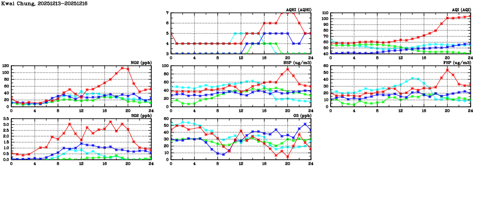 | Air Quality Data Time Series in Kwai Chung (2025/12/16) | ( Line colors: Day -3 Day -2 Day -1 Current day ) | 2D Map Current AQHI |