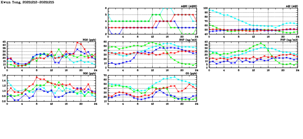 | Air Quality Data Time Series in Kwun Tong (2025/12/15) | ( Line colors: Day -3 Day -2 Day -1 Current day ) | 2D Map Current AQHI |