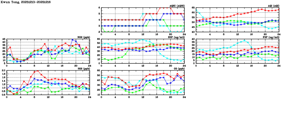 | Air Quality Data Time Series in Kwun Tong (2025/12/16) | ( Line colors: Day -3 Day -2 Day -1 Current day ) | 2D Map Current AQHI |
